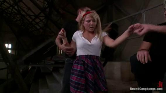 Четверо парней затащили молодую студентку на склад и стали распускать к ней руки, щупали и лапали где можно и где нельзя, стараясь побыстрее раздеть. Чтобы давалка была посговорчевее, заткнули ей за трусы несколько купюр и стали сматывать скотчем за руки и ноги, поставили на коленки и стали по очереди подносить ей члены к ротику, чтобы она делала минет.